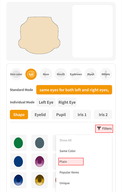 In the face creation screen, you can narrow your search using the Filter function under the “Pupil” and “Iris 2” categories.