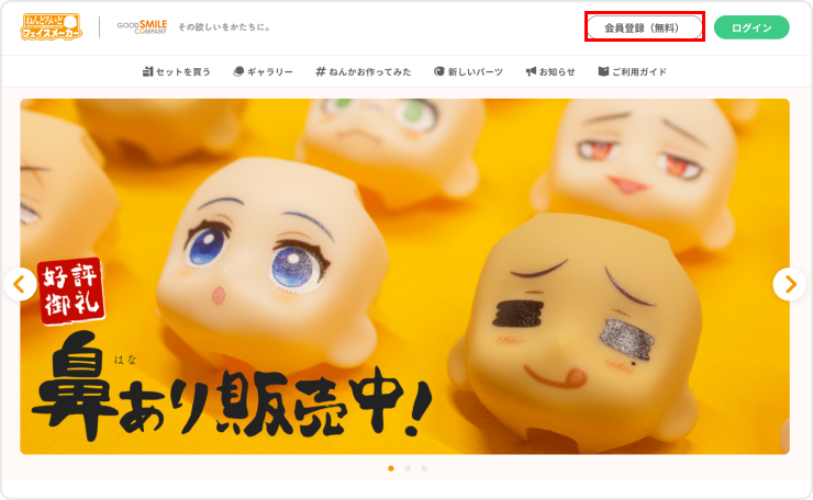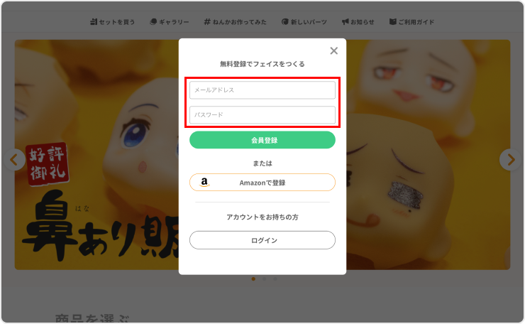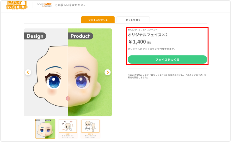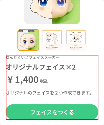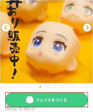 会員登録を完了しログインすると、トップページなどに表示される【フェイスをつくる】ボタンを押してください。 次の画面で、商品内容をご確認のうえ、再度【フェイスをつくる】ボタンを押して、フェイス作成画面に進んでください。 フェイス作成画面では、オリジナルのフェイスを2つまで作成できます。