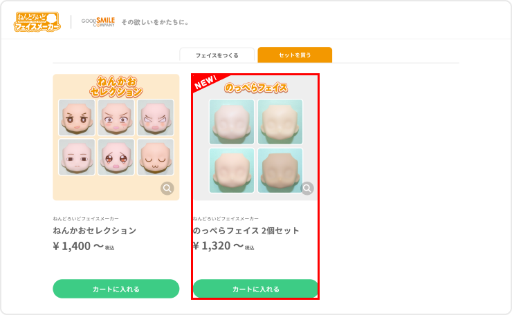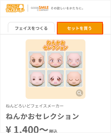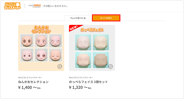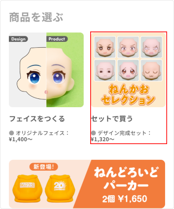 セット販売コーナーでは、カスタマイズ不要のセット商品を2個からご注文いただけます。 トップページの【セットを買う】、またはフェイスをつくる画面の【セットを買う】タブから画面を開き、商品一覧よりご希望のセット商品をお選びください。
