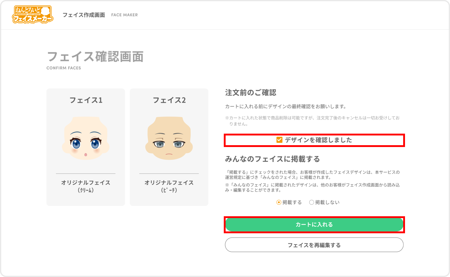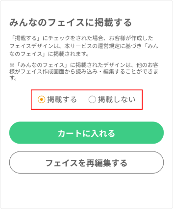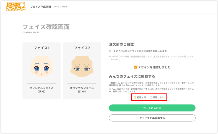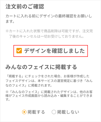 フェイス確認画面では、作成したフェイスの最終確認を行います。 内容に問題がなければ【デザインを確認しました】に✓を入れてください。 次に「みんなのフェイス」への掲載可否を選択し、【カートに入れる】ボタンを押して、カート画面に進んでください。
