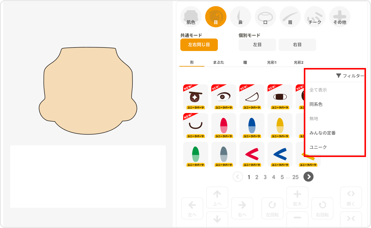 目パーツには以下の2種類のモードがあります。 ・共通モード:選択したパーツが両目に反映されます。 ・個別モード:選択したパーツを左目または右目のみに反映させます(ウインクなどの表現に最適)。