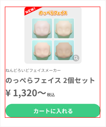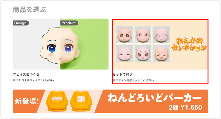 のっぺらフェイス のっぺらフェイスは、印刷加工が施されていない無地のフェイスです。 「クリーム」「アーモンドミルク」「ピーチ」「シナモン」の各カラーを2個1セットからご注文いただけます。 ※2025年9月25日より「フェイス作成画面」での販売を終了し、「セット販売コーナー」にて販売を開始しています。 ねんどろいどパーカー ねんどろいどパーカーは、ねんどろいどのボディパーツ部分に着せ替えできる衣装パーツです。 パーカー専用のセット販売コーナーにて、2個1セットからご注文いただけます。