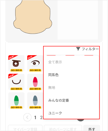 フィルター機能では、「同系色」「無地」「みんなの定番」「ユニーク」などのテーマにあわせてパーツの並び順を絞り込むことができます。