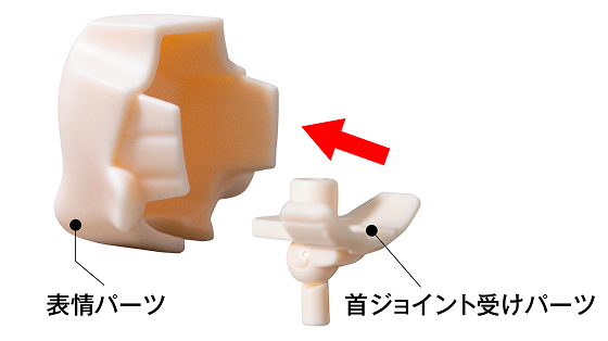 表情パーツの凸部分を後頭部パーツの凹部分に合わせ、幅を少し広げるようにしながら慎重にはめ込んでください。